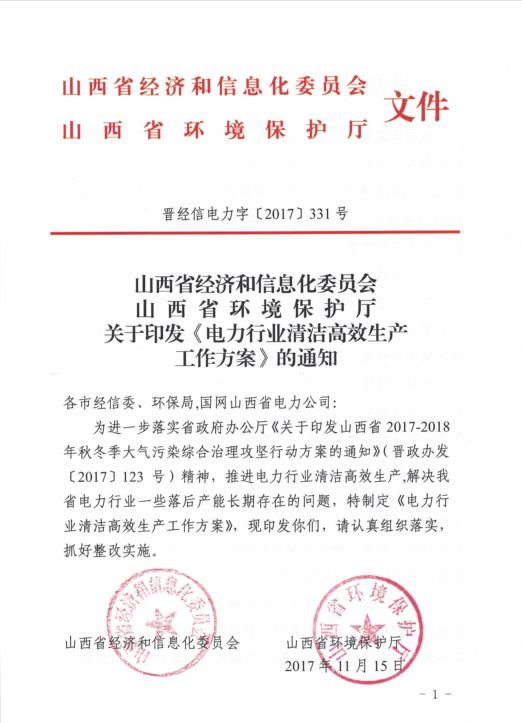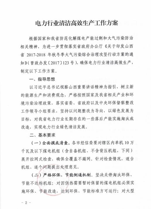 ??為進(jìn)一步落實省政府辦公廳《關(guān)于印發(fā)山西省2017-2018年秋冬季大氣污染綜合治理攻堅行動方案的通知》(晉政辦發(fā)〔2017〕123號)精神,推進(jìn)電力行業(yè)清潔高效生產(chǎn),解決我省電力行業(yè)一些落后產(chǎn)能長期存在的問題,特制定《電力行業(yè)清潔高效生產(chǎn)工作方案》,現(xiàn)印發(fā)你們,請認(rèn)真組織落實,抓好整改實施。