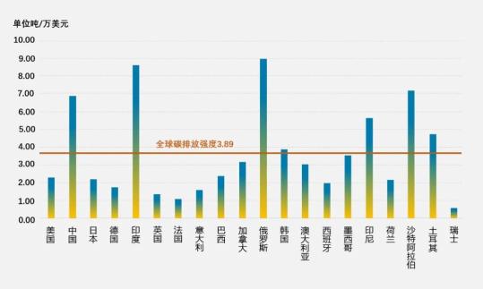 我國碳排放總量在2008年首度超過美國,2019年已接近美國的2倍,占全球總碳排放的27.2%,超過美國和歐盟的總和。人均碳排放量已超過歐盟,排名全球第二。如延續原有發展模式,將在短期內超過美國。2019年,碳排放強度為6.88噸/萬美元,高出全球平均43%。